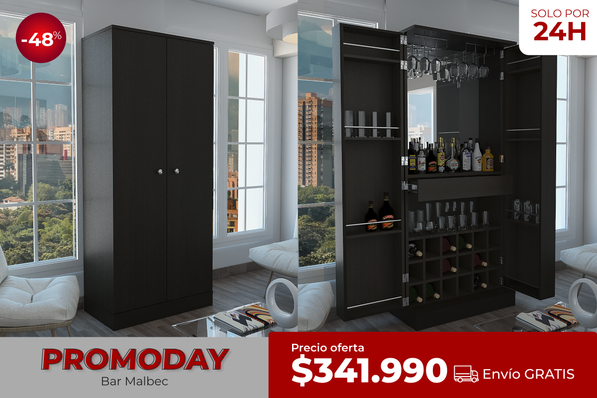 Bar Esquinero Kava, Beijing, Wengue y Negro, con dos puertas batientes, espacio para botellas y copas