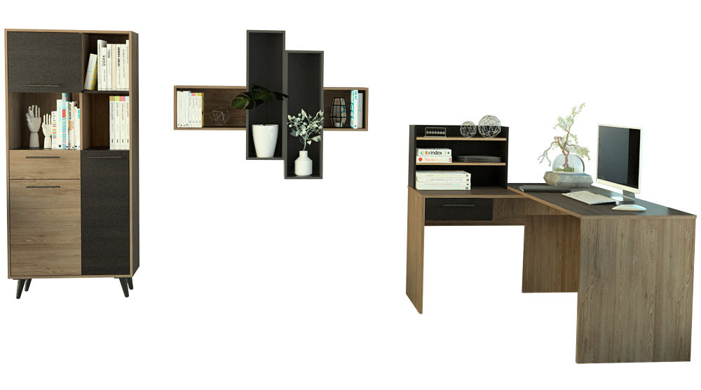 Combo Home Office: Archivador, con 2 puertas batientes y varios entrepaños. Biblioteca, con 3 entrepaños, 2 puertas batientes y manijas....