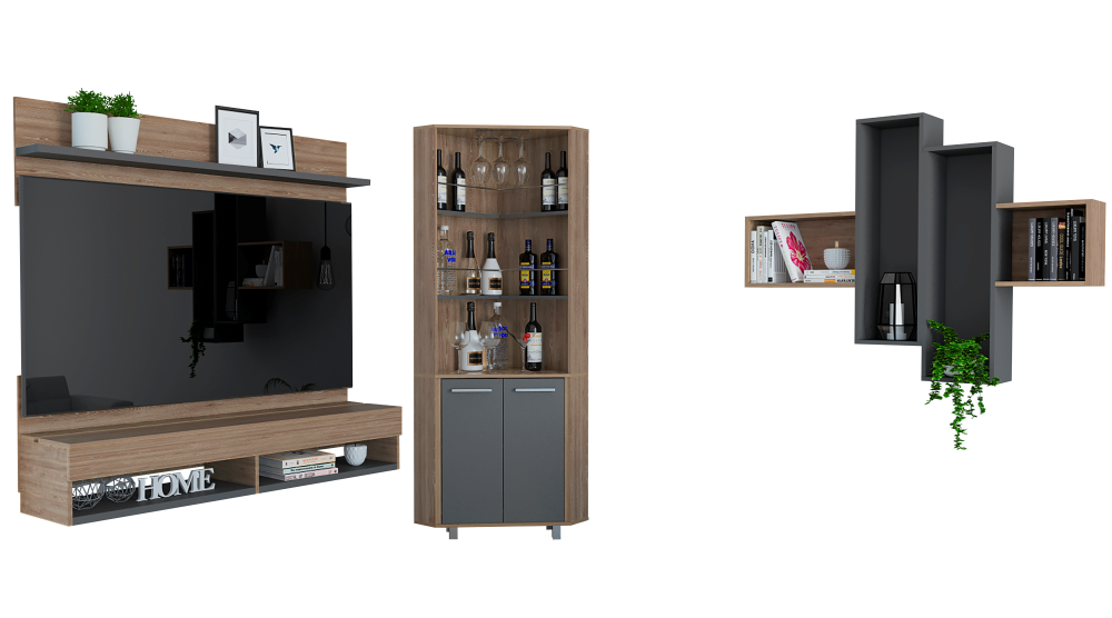 Combo The Wall: Bar, con 3 repisas de espacio amplio para colocar botellas y 2 puertas batientes. Panel TV, con...
