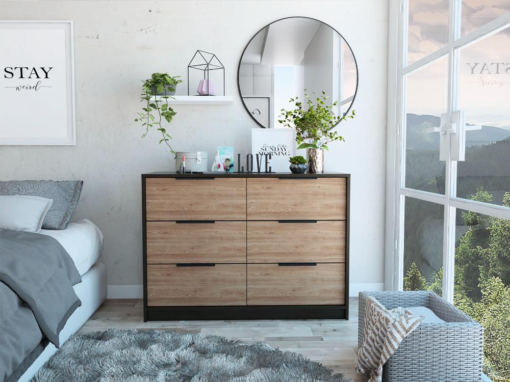 Cómoda, con 5 cajones, diseño moderno con combinación de colores, manijas metálicas, y superficie para elementos decorativos. Elaborado en Madera...