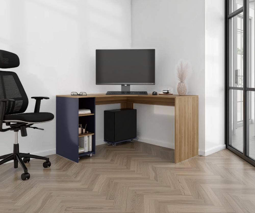 Escritorio En L Dafne, Fresno Europeo y Azul Kronos , con Dos Entrepaños y Base con Rodachinas Para Fácil Desplazamiento