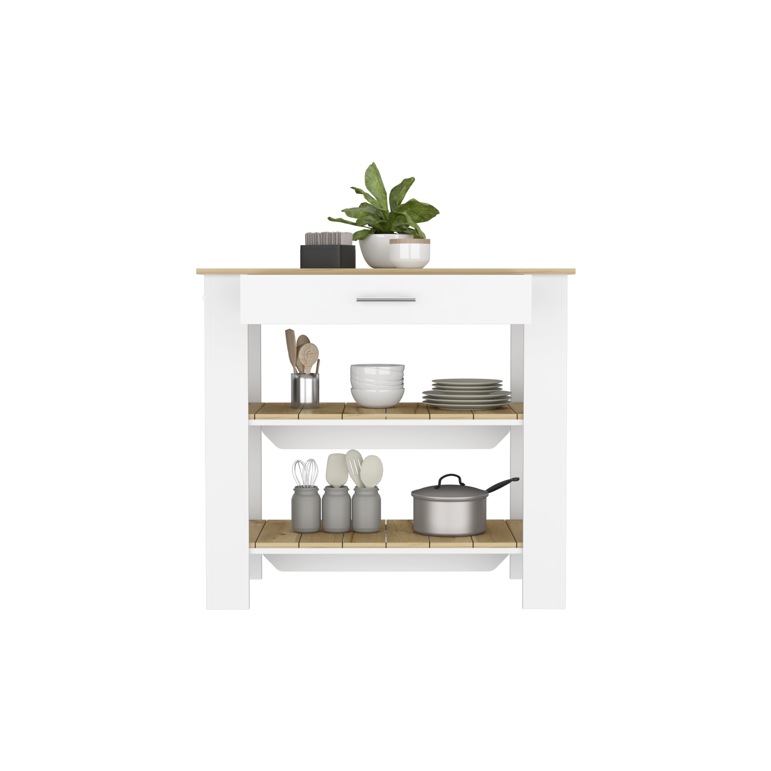 Mesa De Cocina Ccala, Blanco y Macadamia, con entrepaños para colocar objetos de cocina