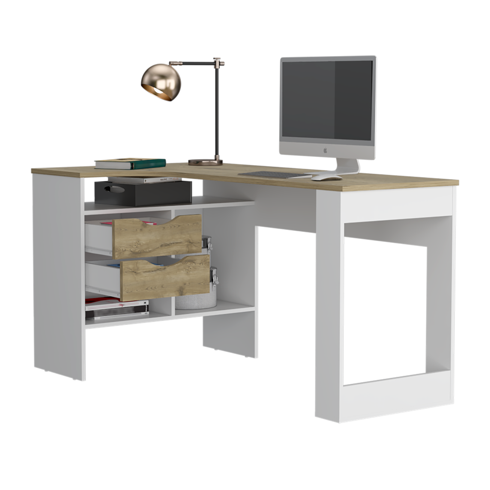 Escritorio Noah, Macadamia y Blanco Marquez, con dos cajones