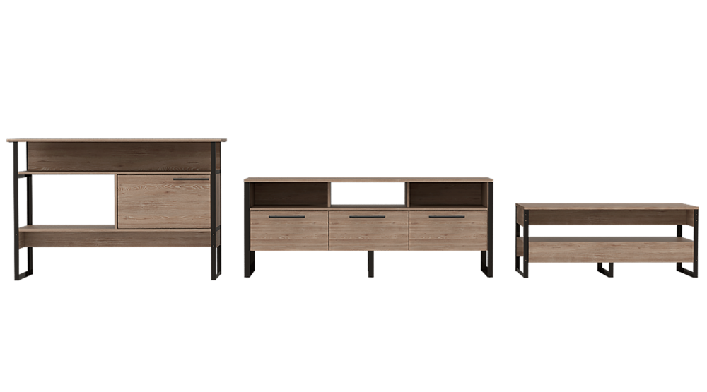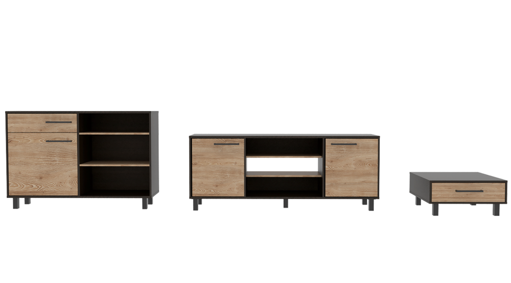 Combo Essential: Mesa de centro, con amplio entrepaño para colocar objetos y patas de madera. Arrimo, con dos repisas. Rack...