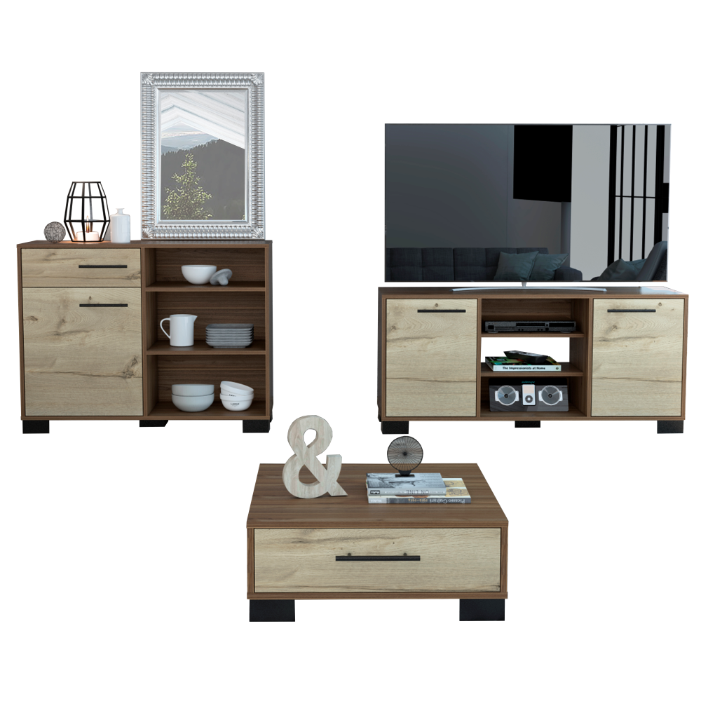 Combo Kaia: Rack, con capacidad para televisor de 55 pulgadas. Mesa de centro, con un cajón deslizable, varios entrepaños para...