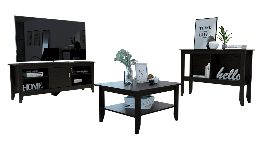 Combo Essential: Mesa de centro, con amplio entrepaño para colocar objetos y patas de madera. Arrimo, con dos repisas. Rack...