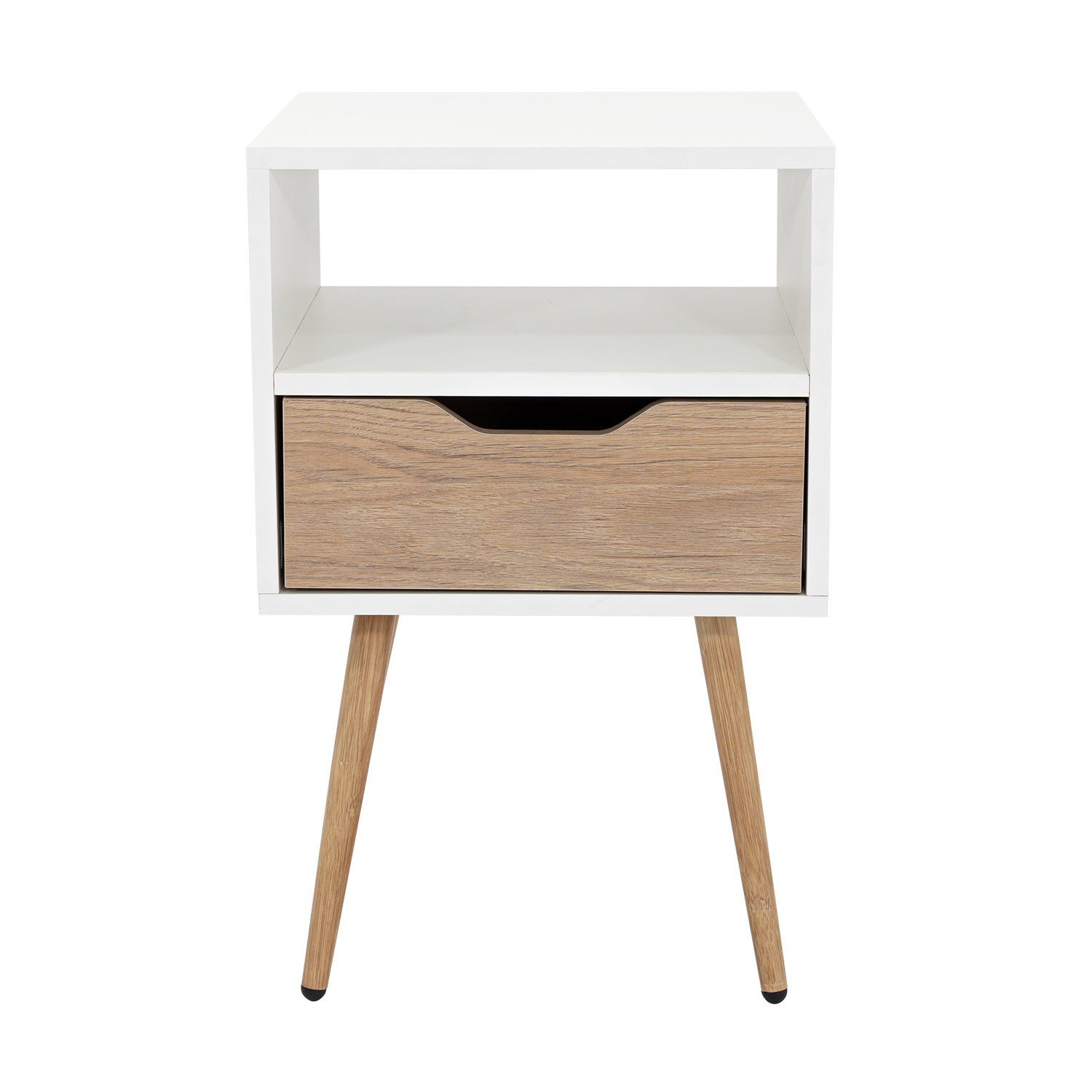 Velador Alesio, Blanco y Rovere, con Patas cortas en Madera y un Cajón