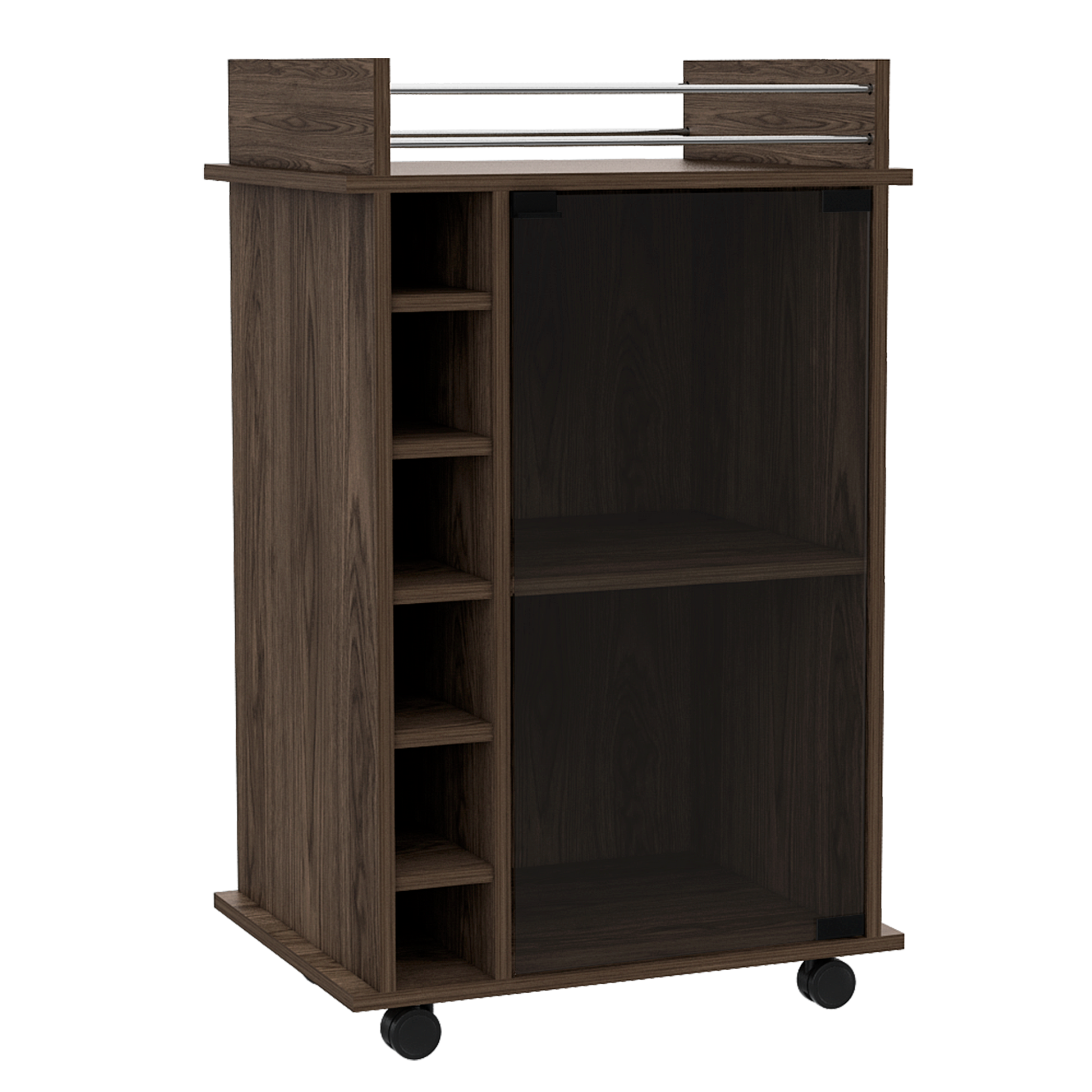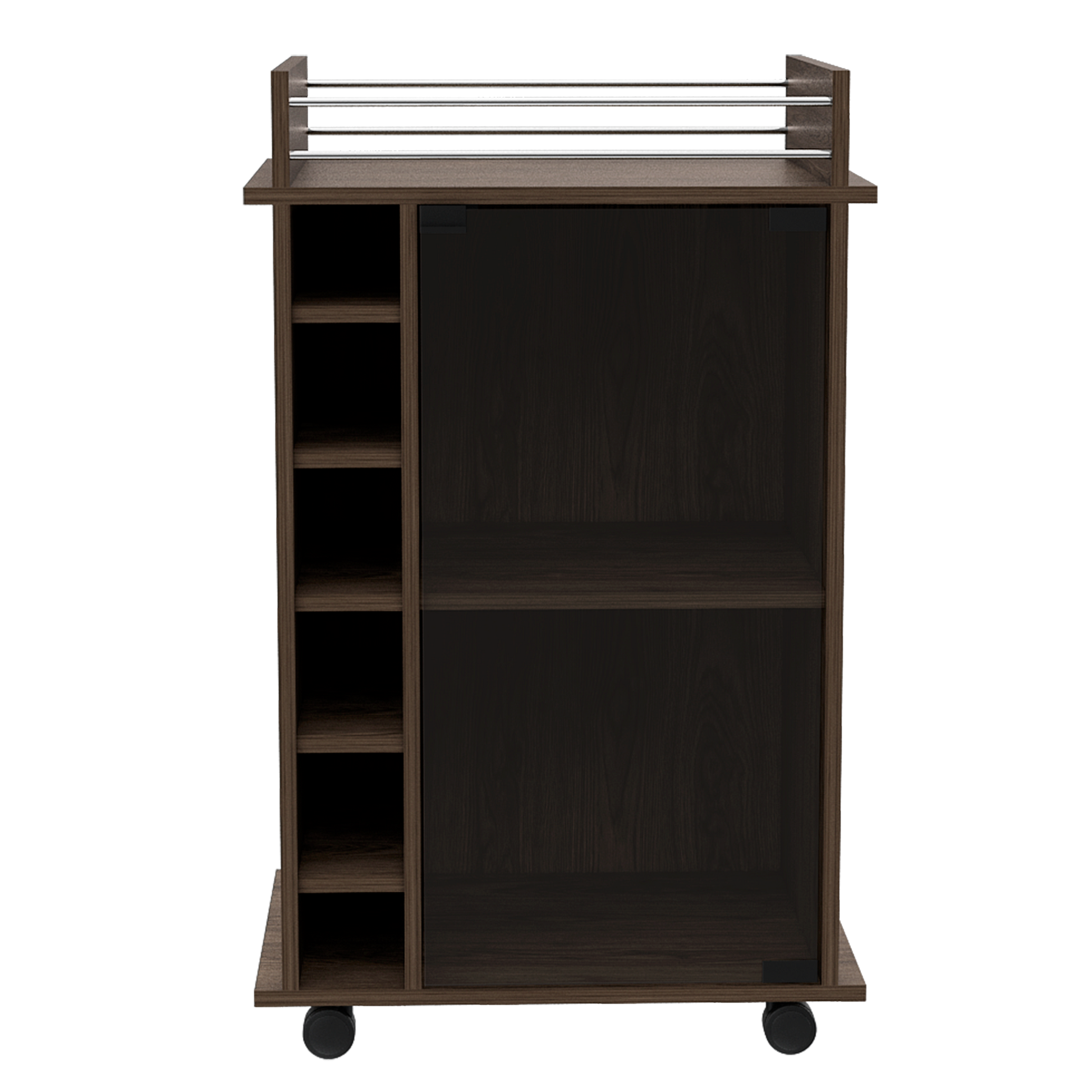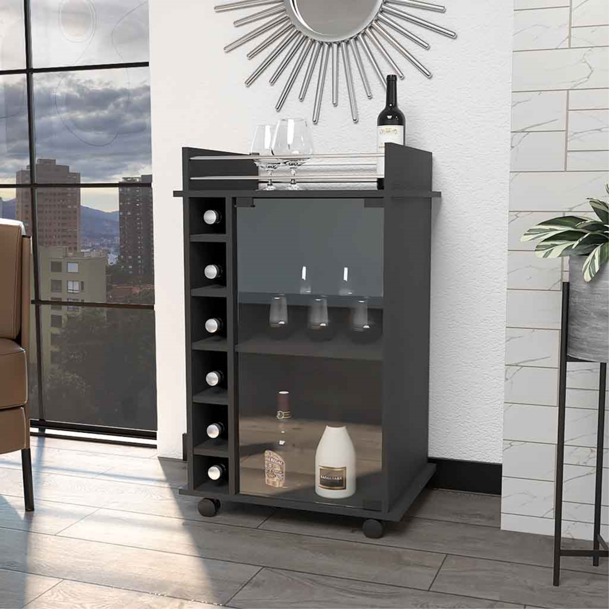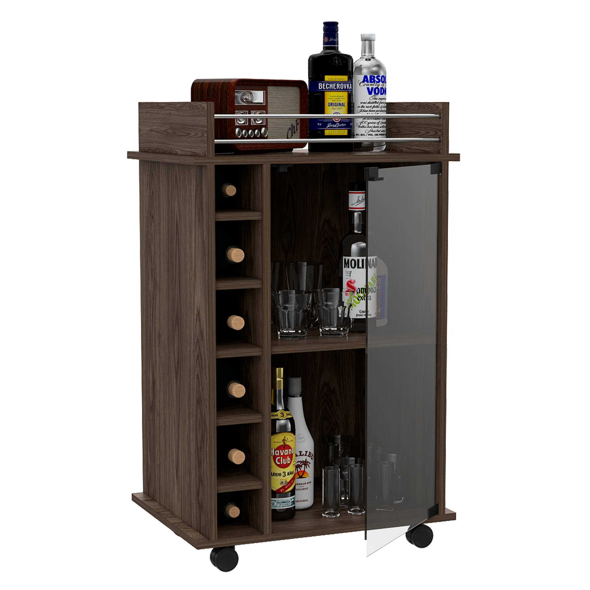 Bar, con 1 puerta de vidrio con push, entrepaños para colocar copas, capacidad para 6 botellas y rodachines para su fácil desplazamiento.