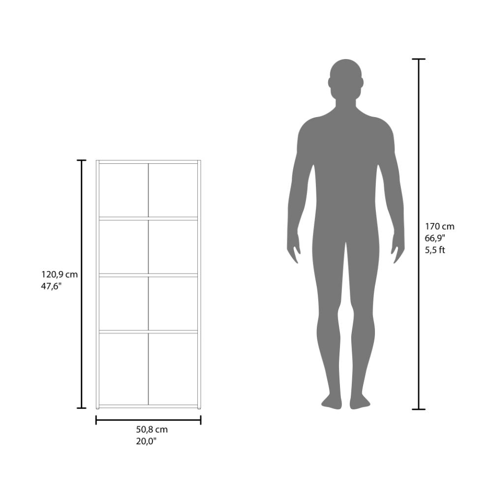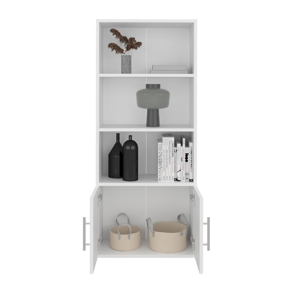 Biblioteca, con dos puertas abatibles, manijas metalicas, amplios espacios para ubicar libros, objetos decorativos y es de fácil instalación.