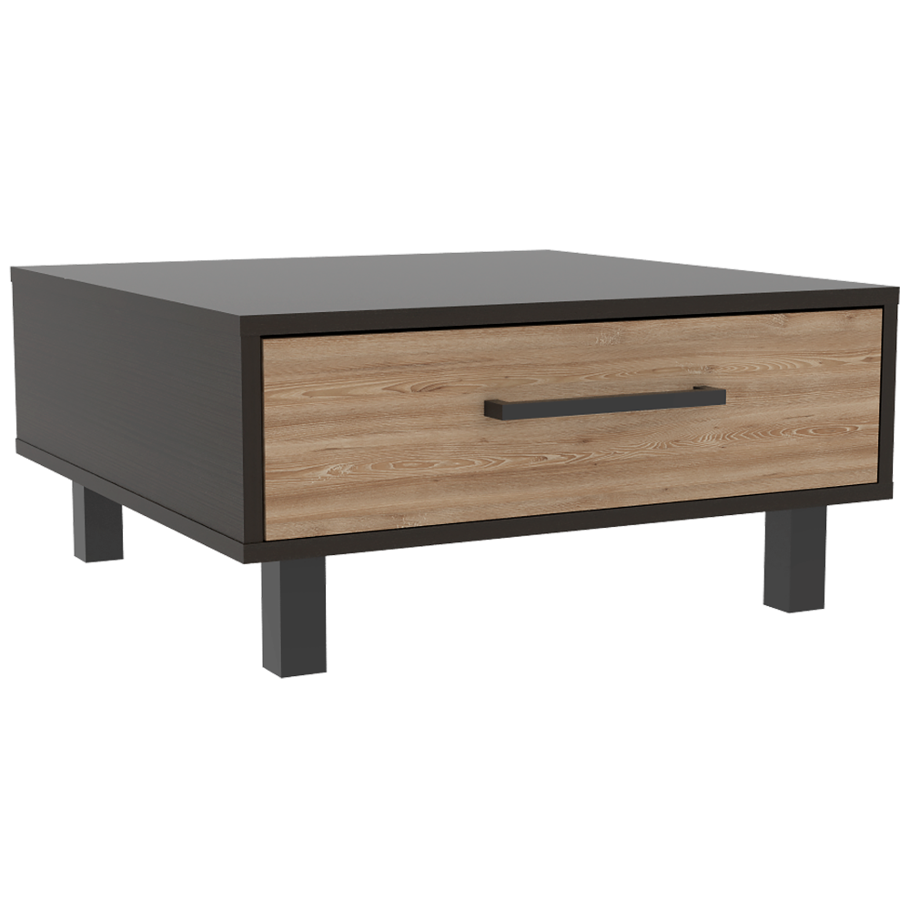 Mesa de centro, con un cajón deslizable, varios entrepaños para colocar objetos y patas de acero.