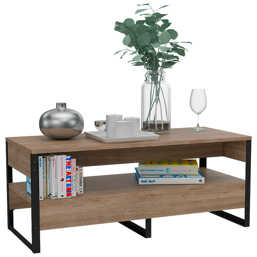 Mesa de centro, con varios entrepaños para colocar objetos y patas metálicas.
