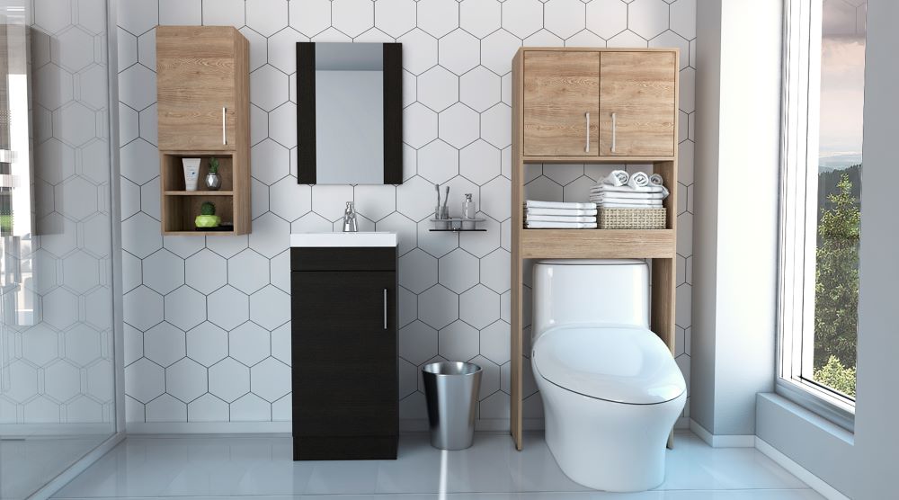 Combo Mybath, Miel y Wengue, incluye botiquín, mueble lavamanos, muro y optimizador