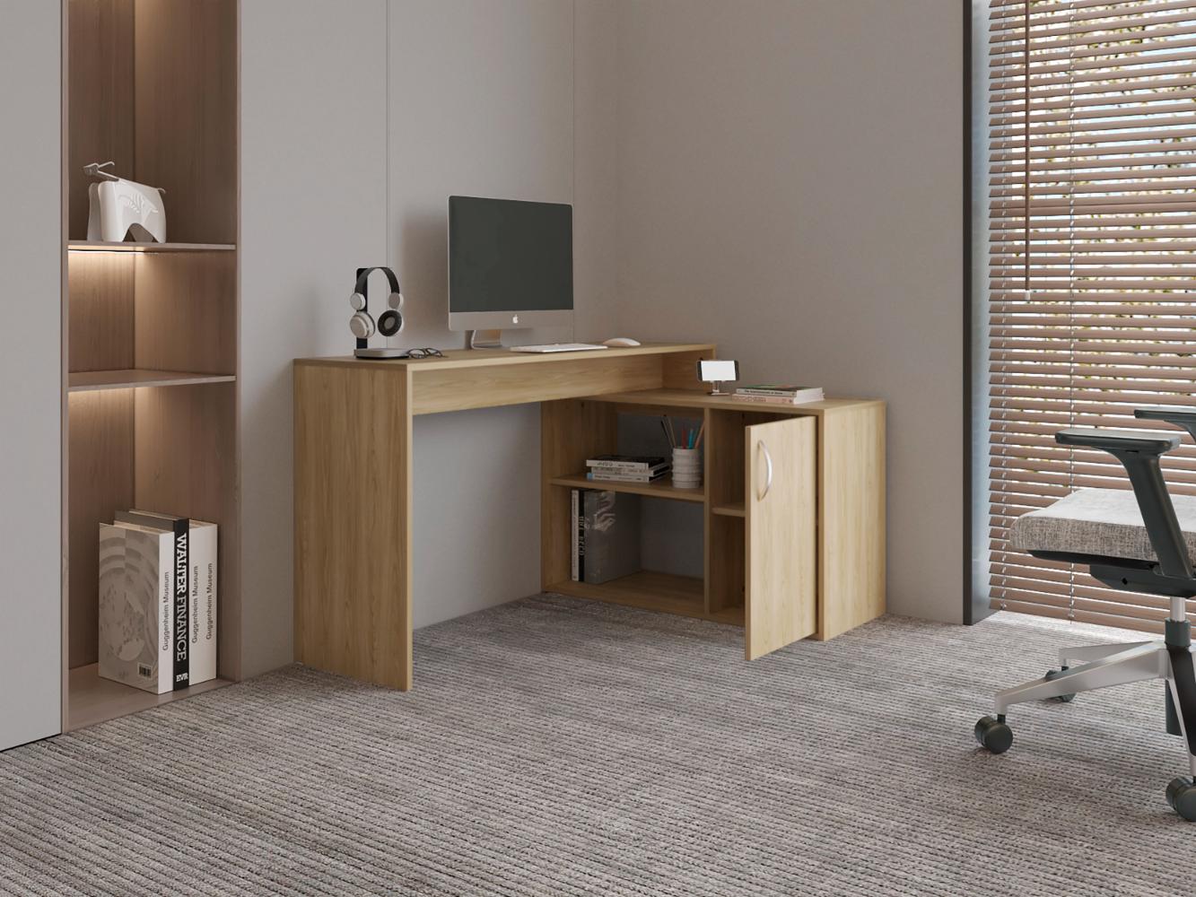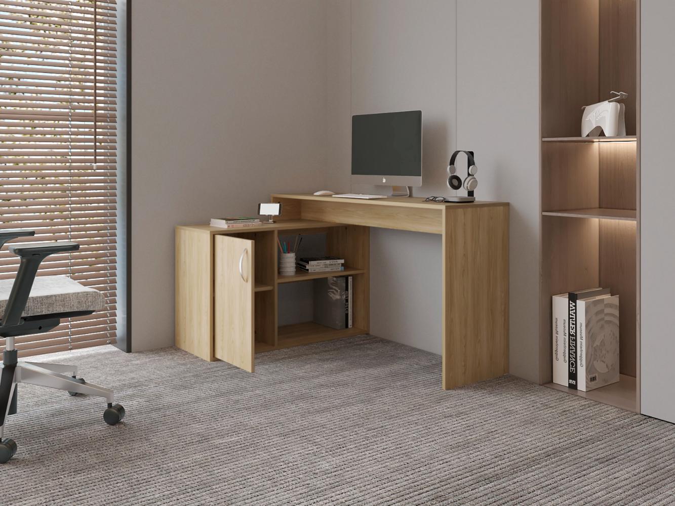 Escritorio con puerta batiente para almacenar libros y otros, compartimentos para objetos decorativos.