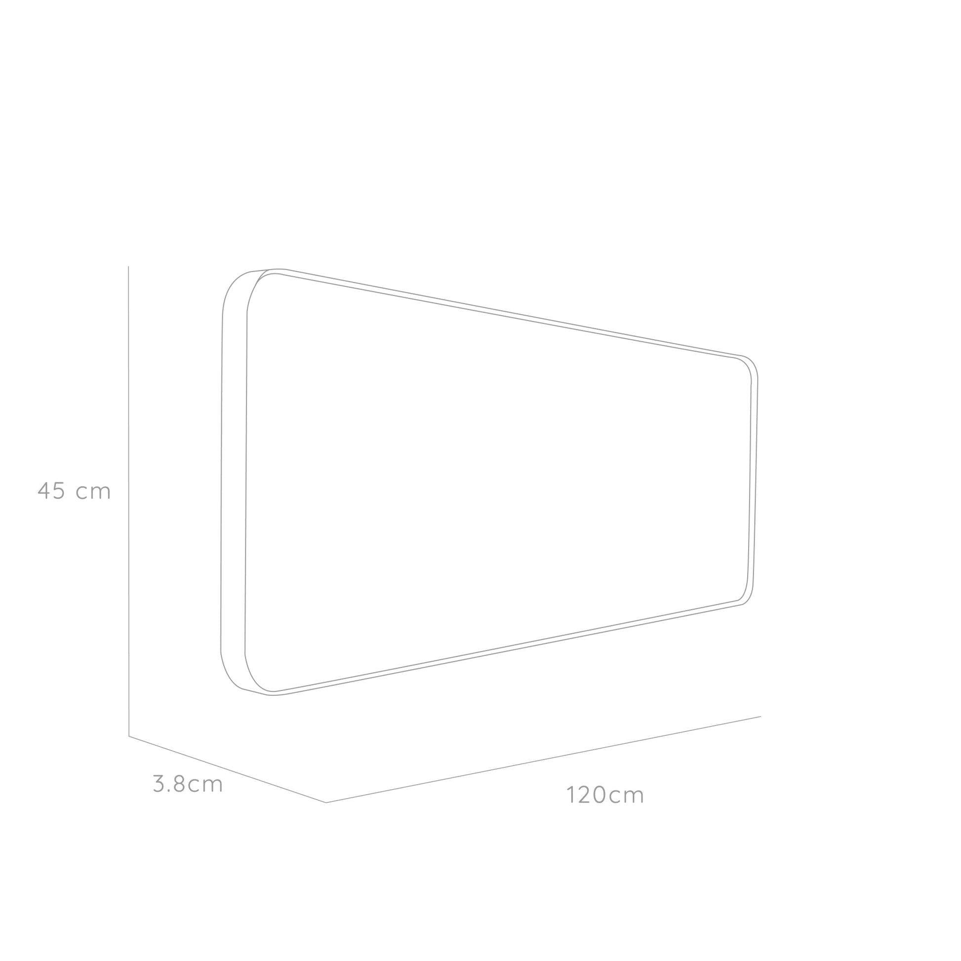 Con bordes redondeados y marco metálico; cuenta con chaflán para su instalación horizontal