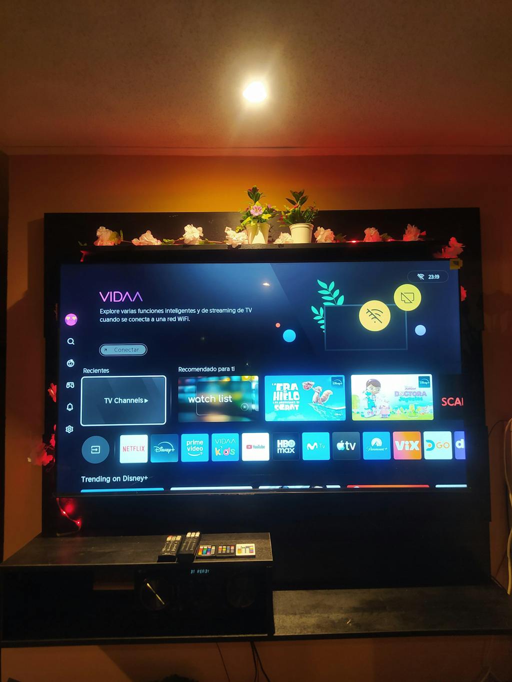 Panel TV, con variedad de entrepaños para colocar objetos y con capacidad para televisor de 55 pulgadas.