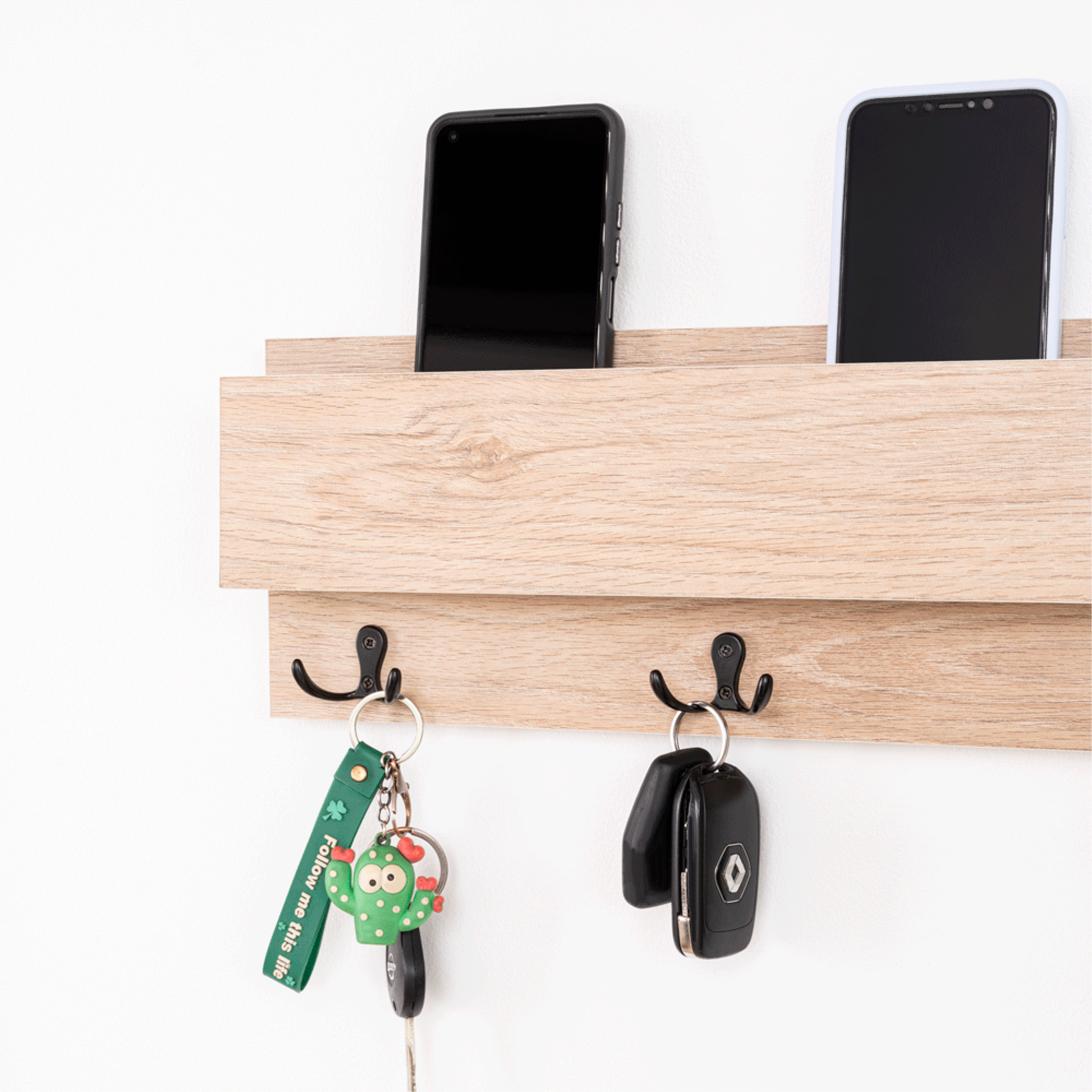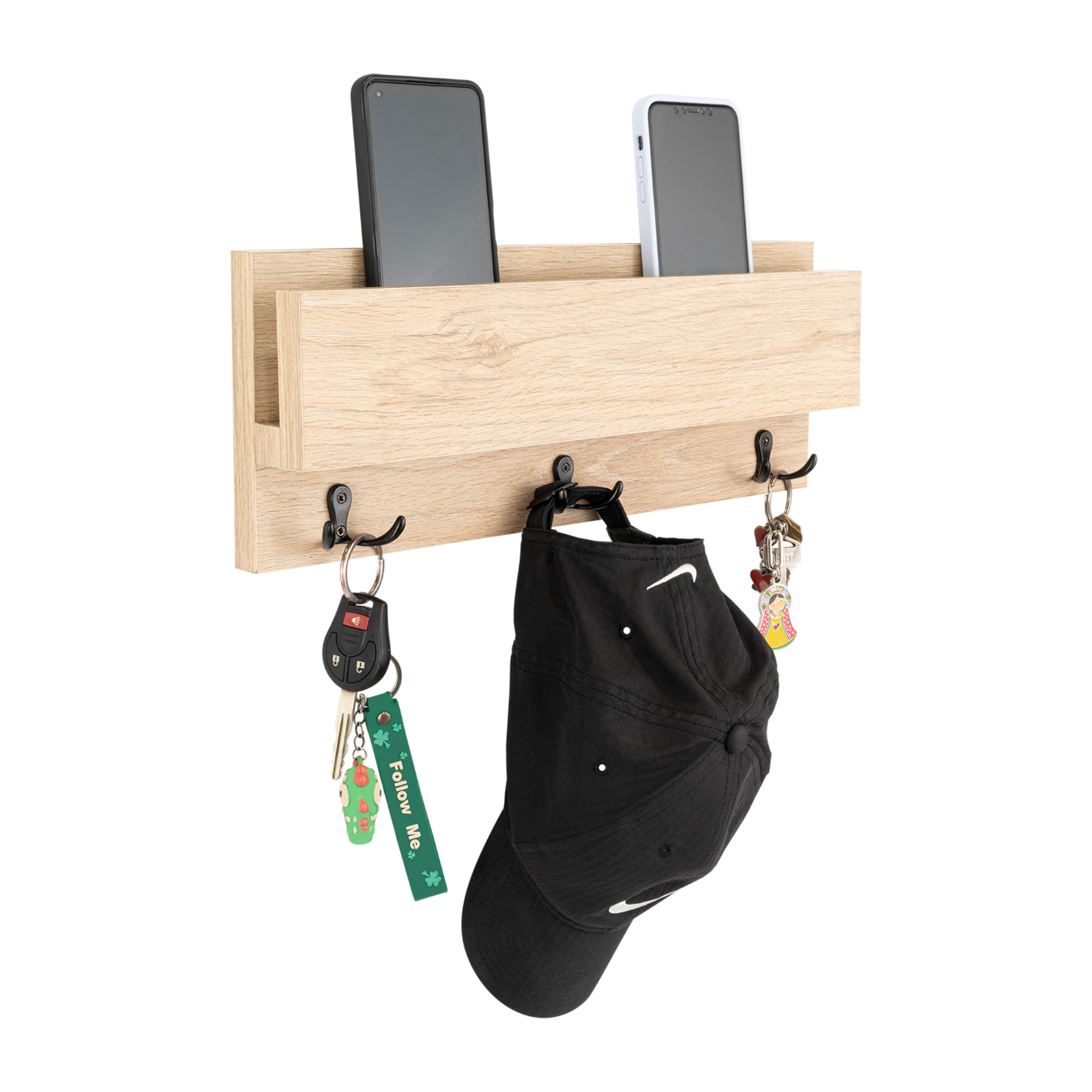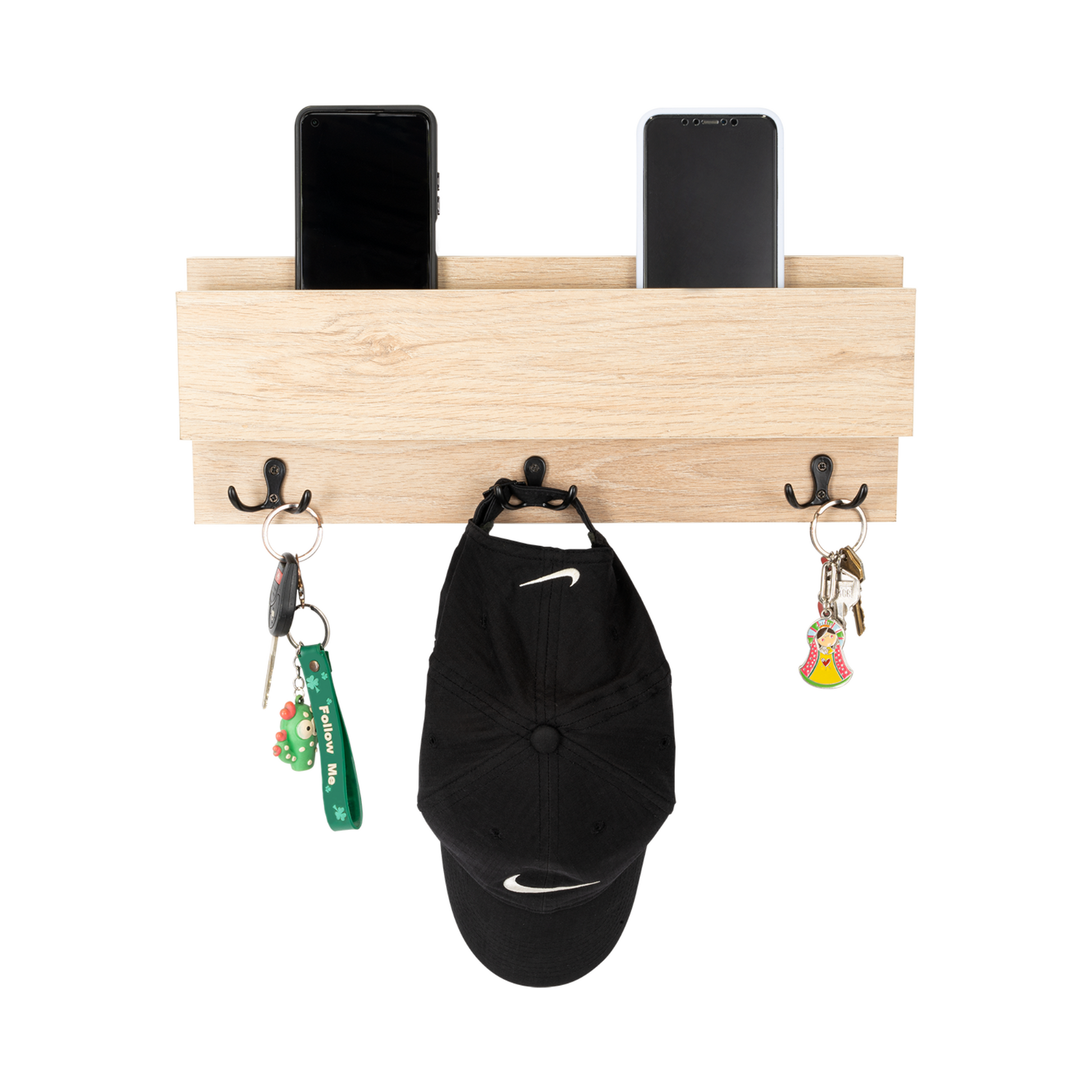 Repisa con 3 ganchos para colgar llaves o accesorios y poner el celular, incluye chazos para instalación a pared.