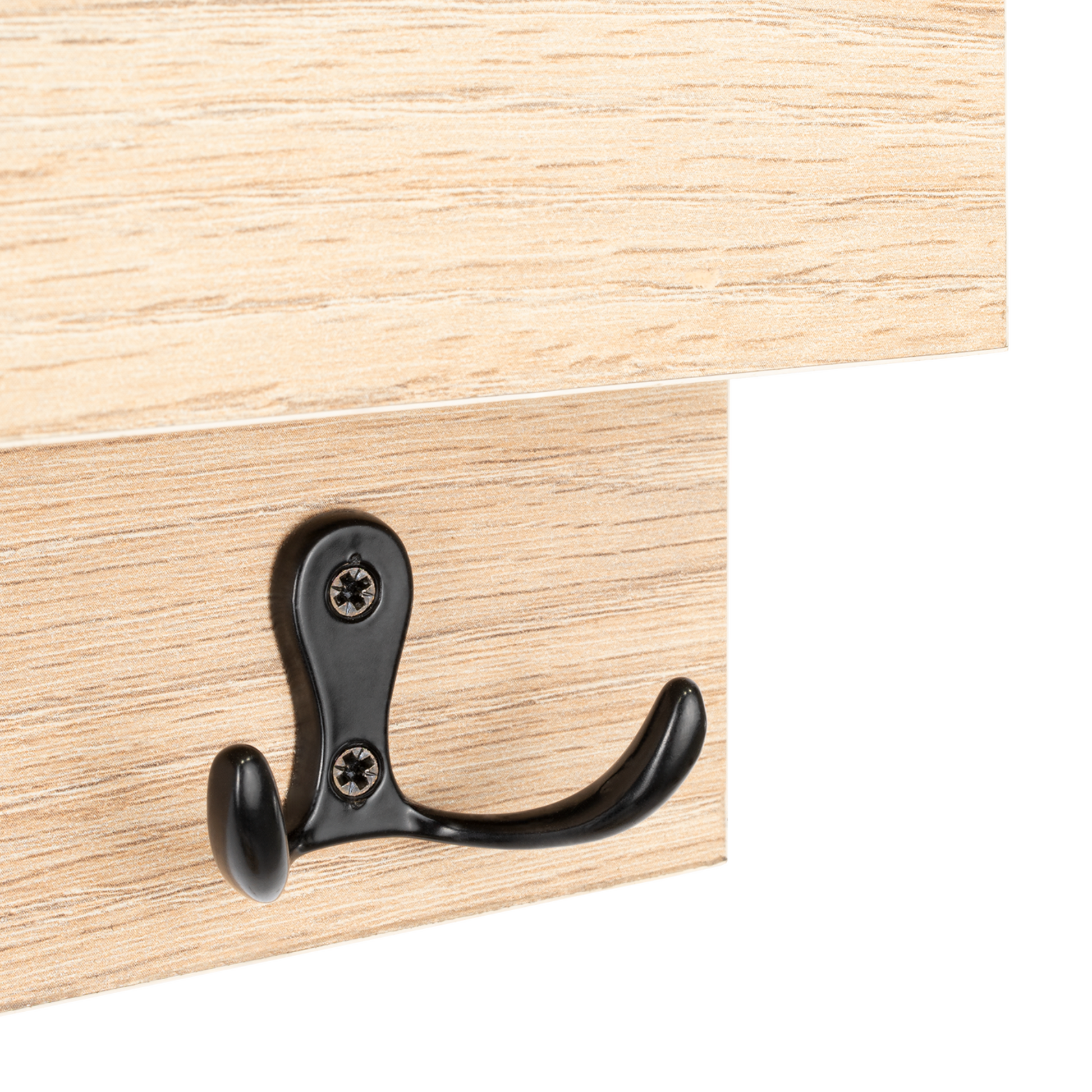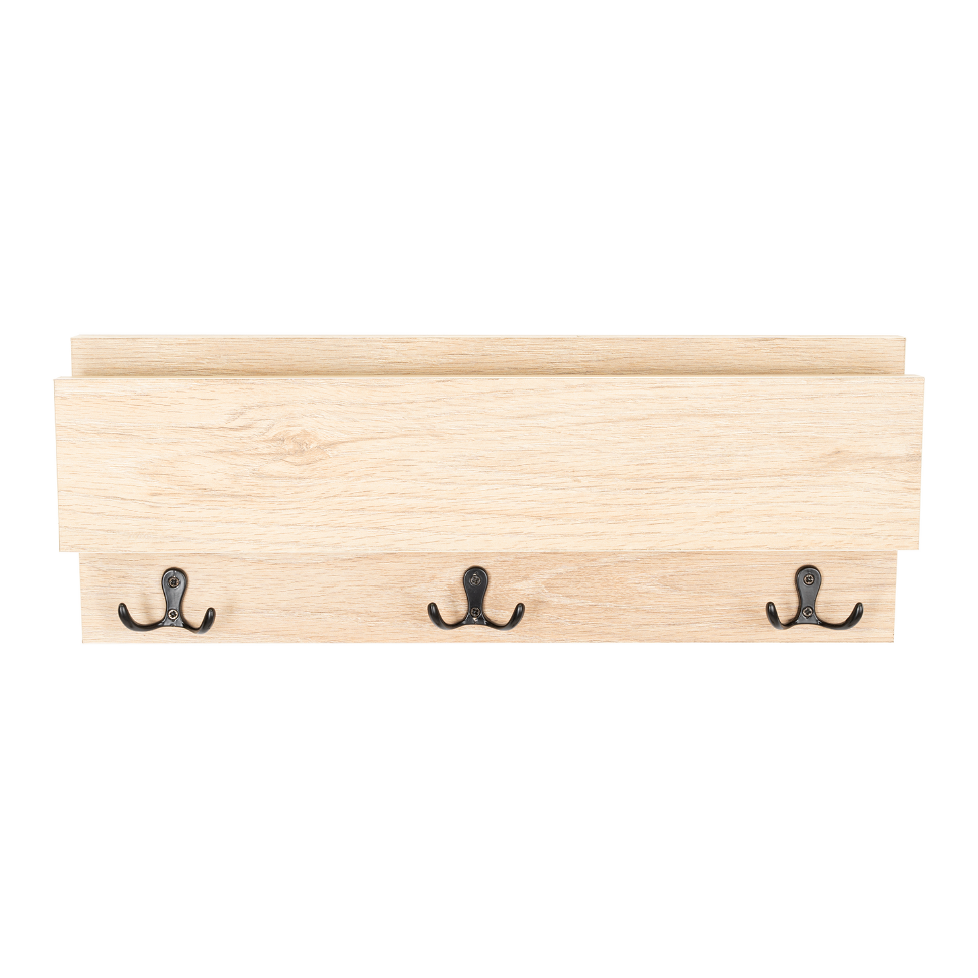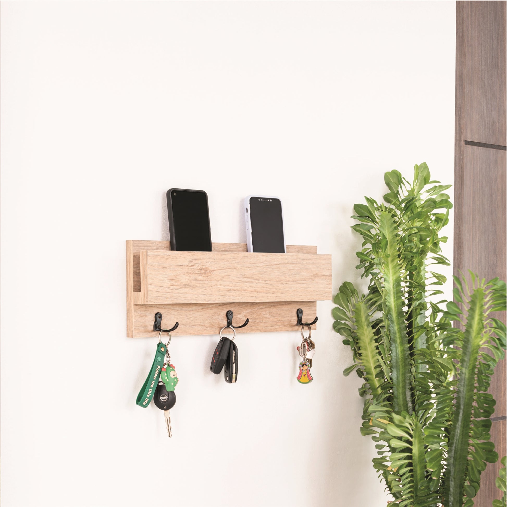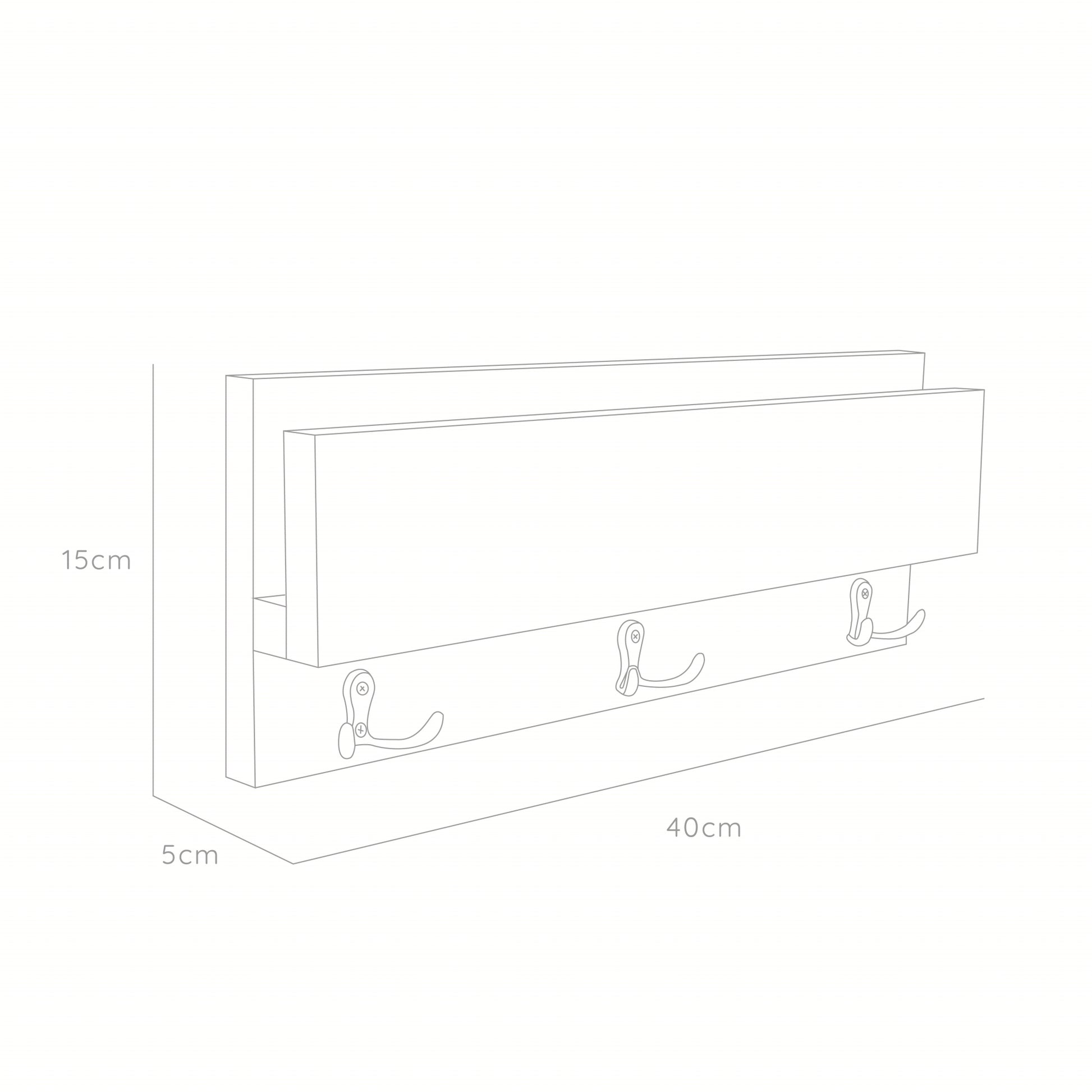 Repisa con 3 ganchos para colgar llaves o accesorios y poner el celular, incluye chazos para instalación a pared.