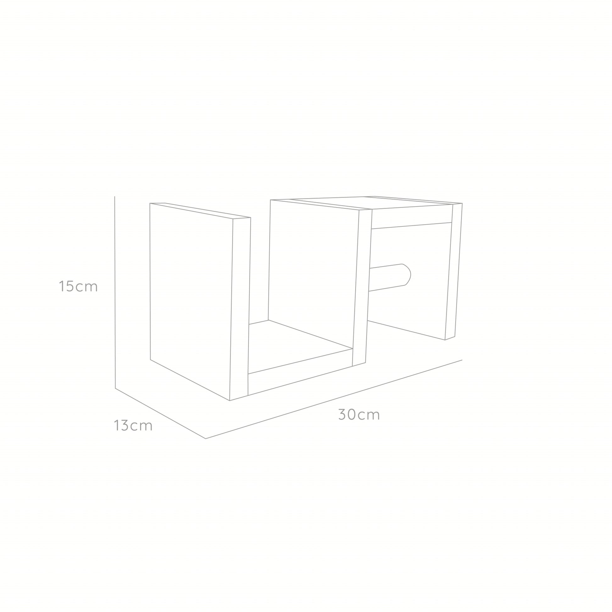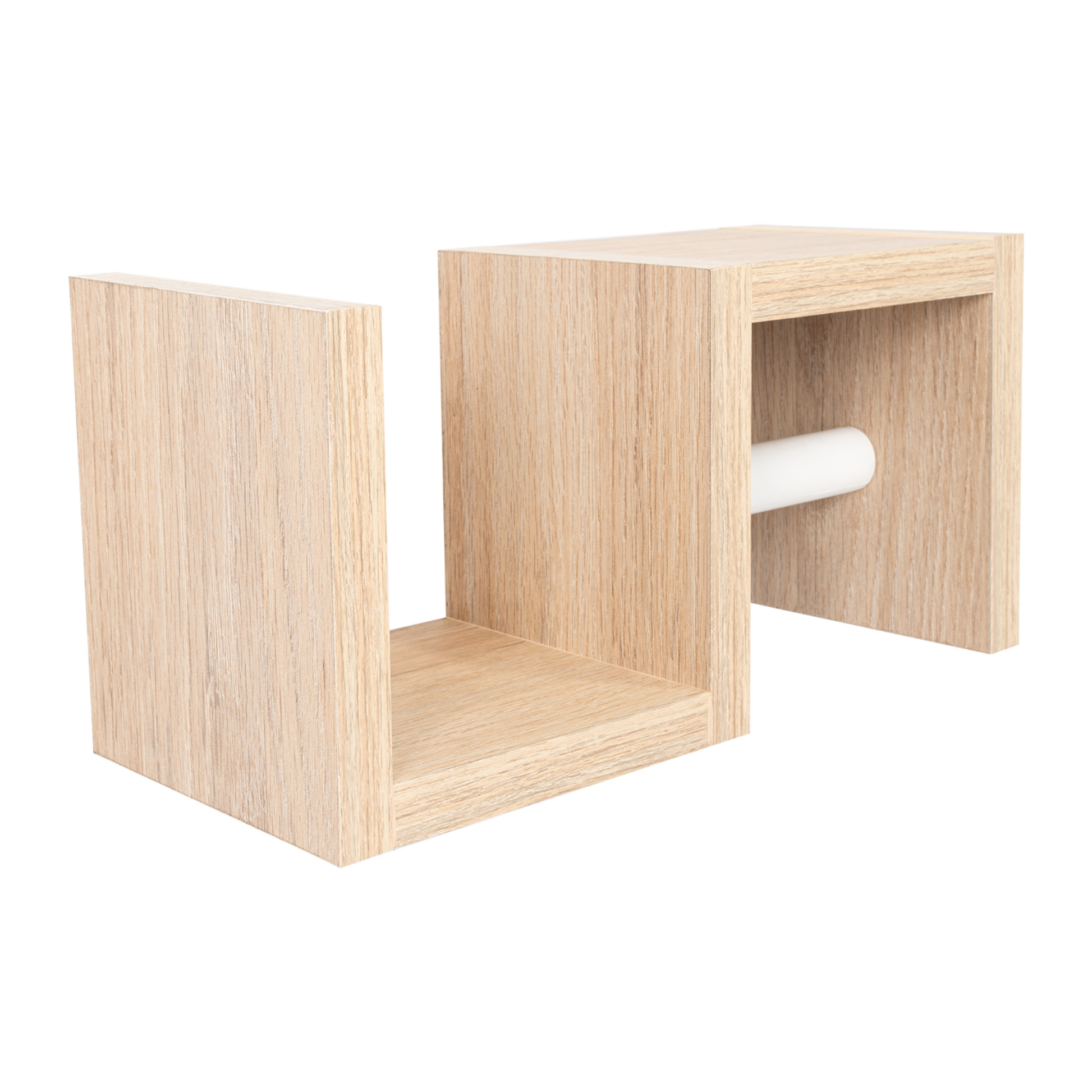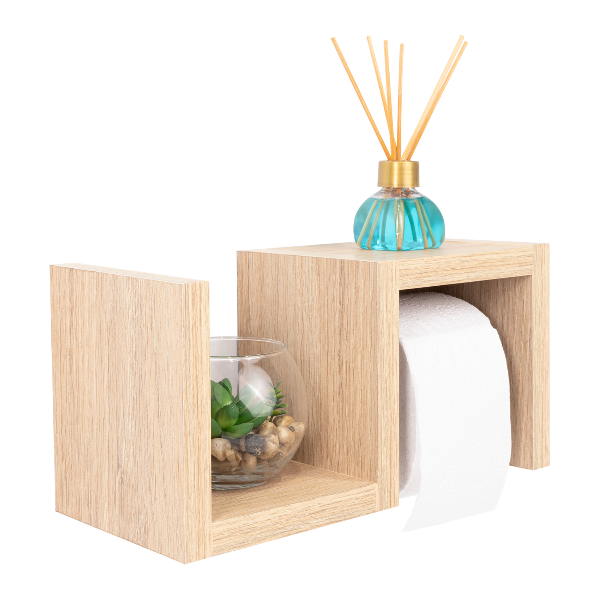 Repisa con soporte para papel higiénico en madera MDP clara Cal 15mm, incluye cantonera para instalación a pared.