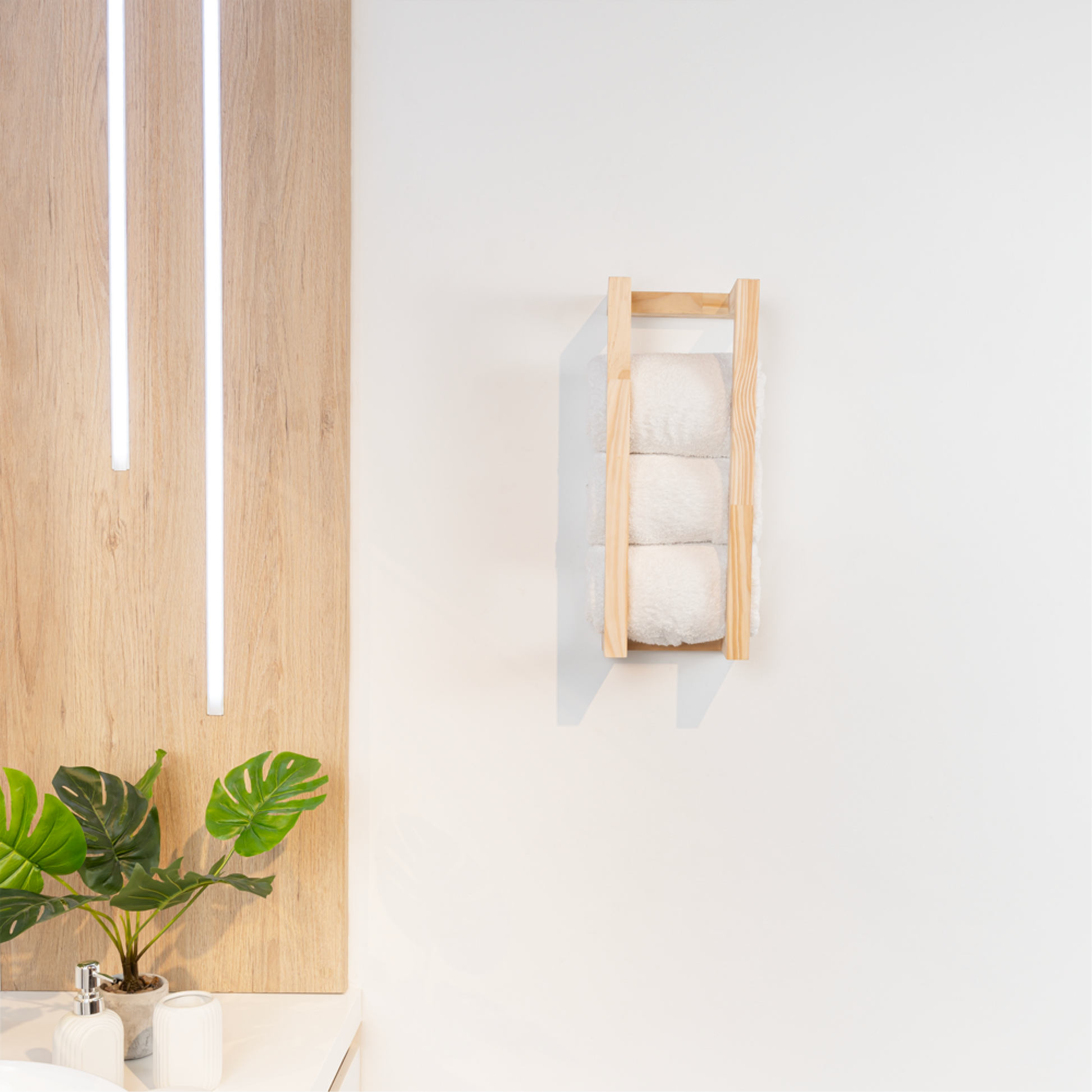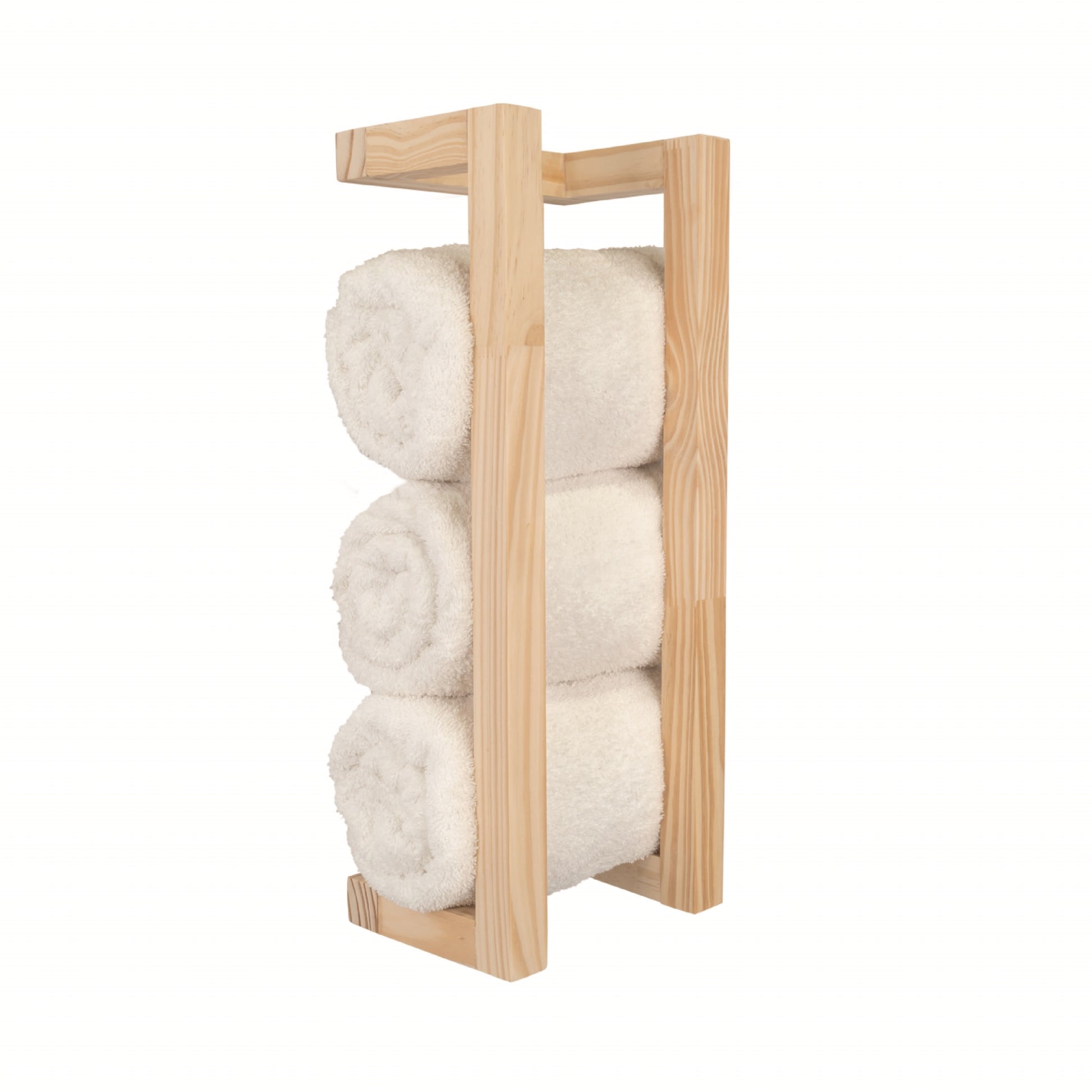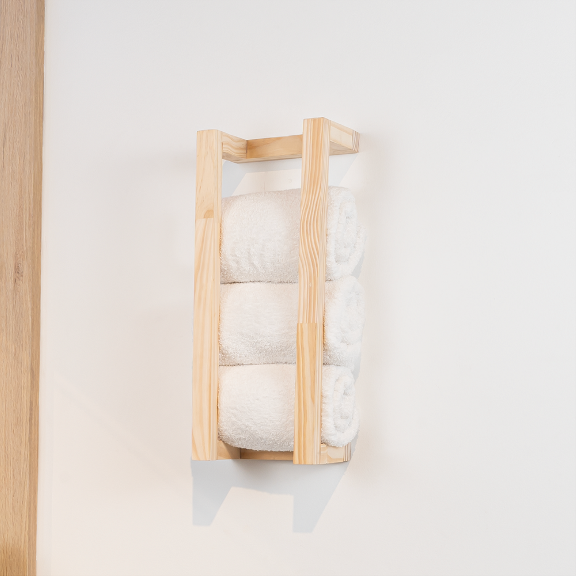 Toallero, en pino de 3x3, color natural; ideal para tus toallas, incluye chazos para instalación a pared.