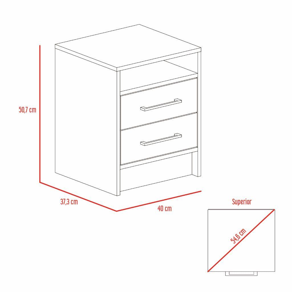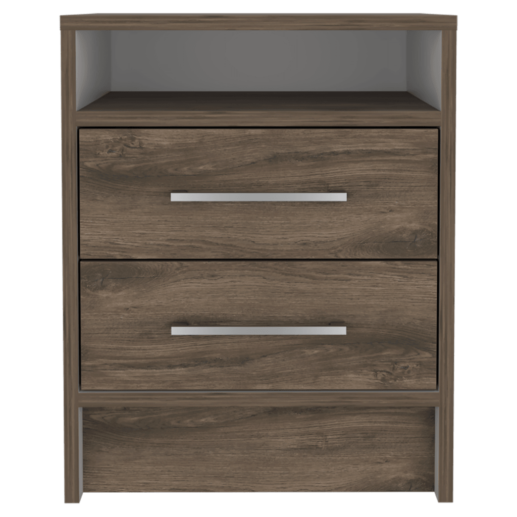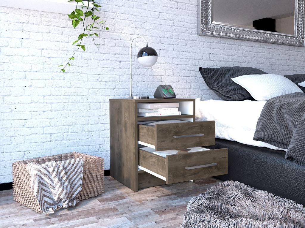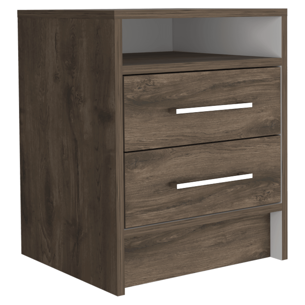 Velador Douglas, Nogal y Blanco, con Un Entrepaño Superior y Dos Cajones Organizadores