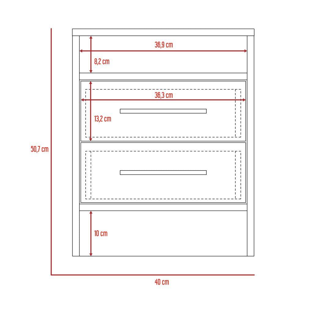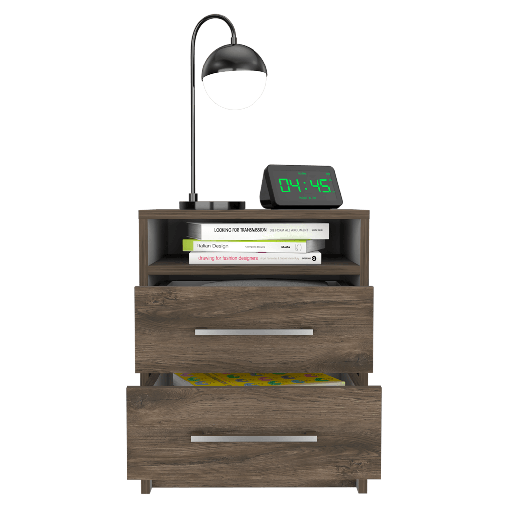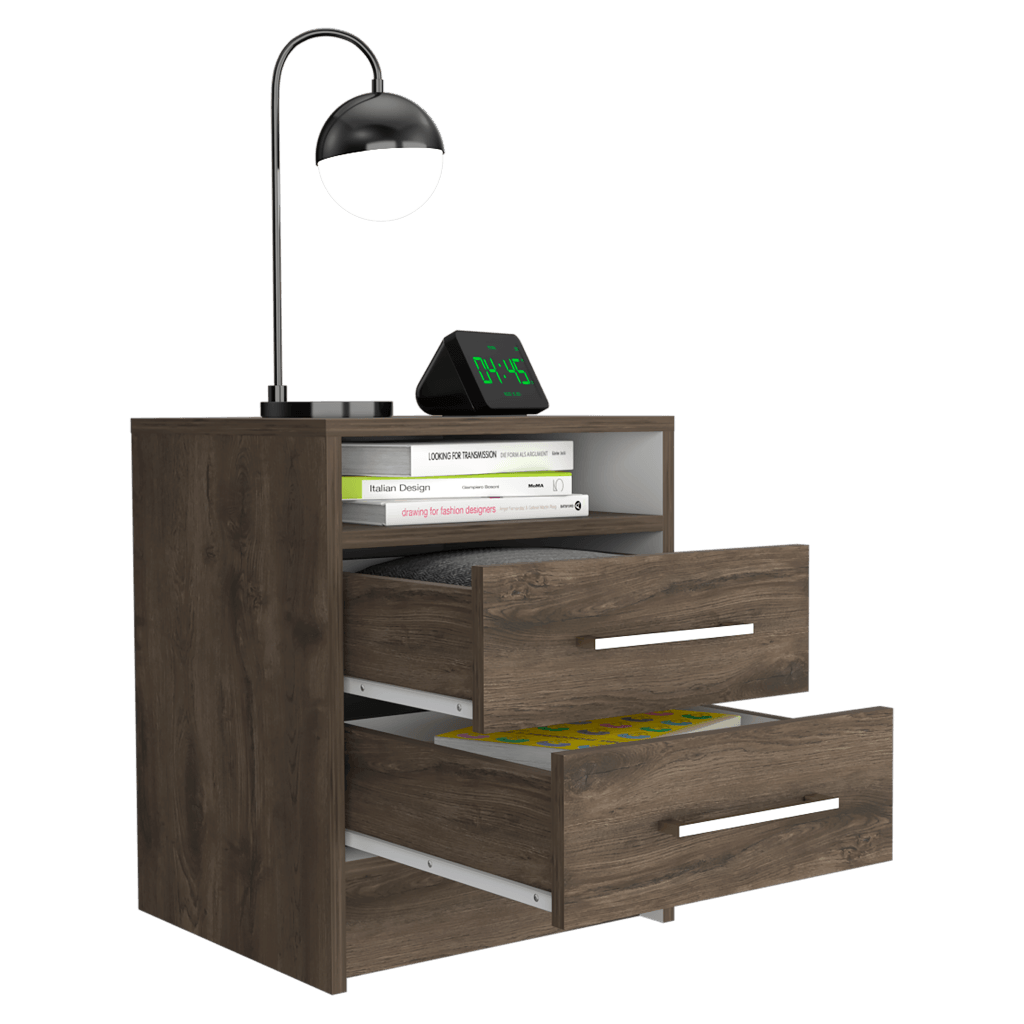 Velador Douglas, Nogal y Blanco, con Un Entrepaño Superior y Dos Cajones Organizadores